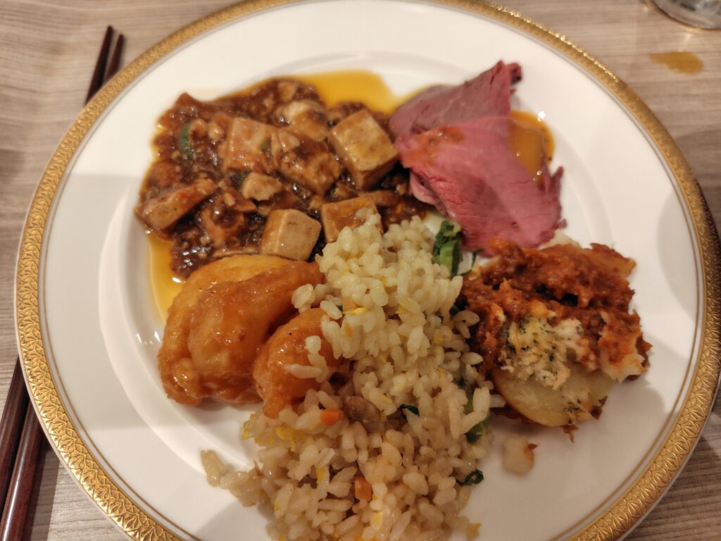 午後はラウンジとレストランでアルコールを含めた飲み放題を楽しみ、翌朝はソフトドリンクで優雅なひとときを過ごしました。夕食、朝食ともビュッフェ形式でした。