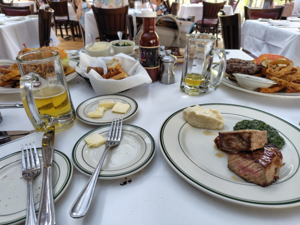 At 13:00, we had lunch at Wolfgang’s Steakhouse. The steak, hamburger, bread, and potatoes were all generous portions, and we couldn’t finish everything. We took the cheesecake to go—perhaps we should have taken the other leftovers as well.