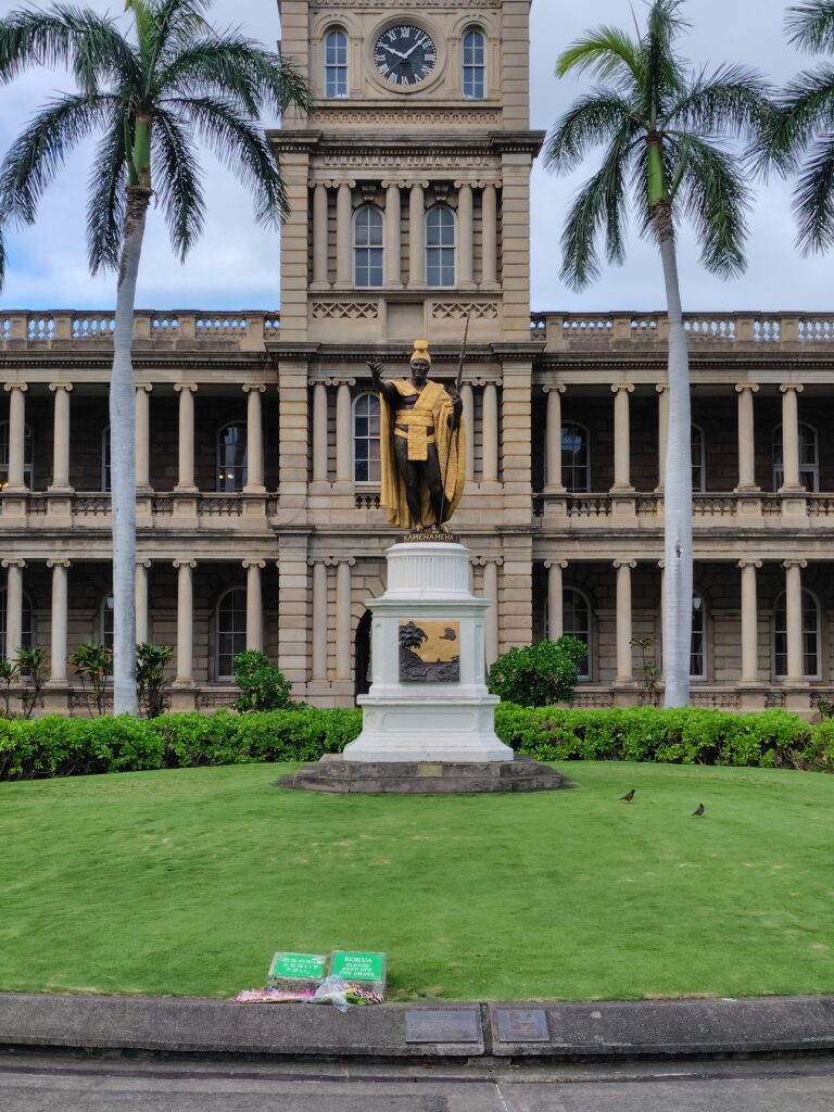 The gold-leaf statue shone brilliantly, symbolizing the great leader who unified Hawaii. - Moanalua Gardens
