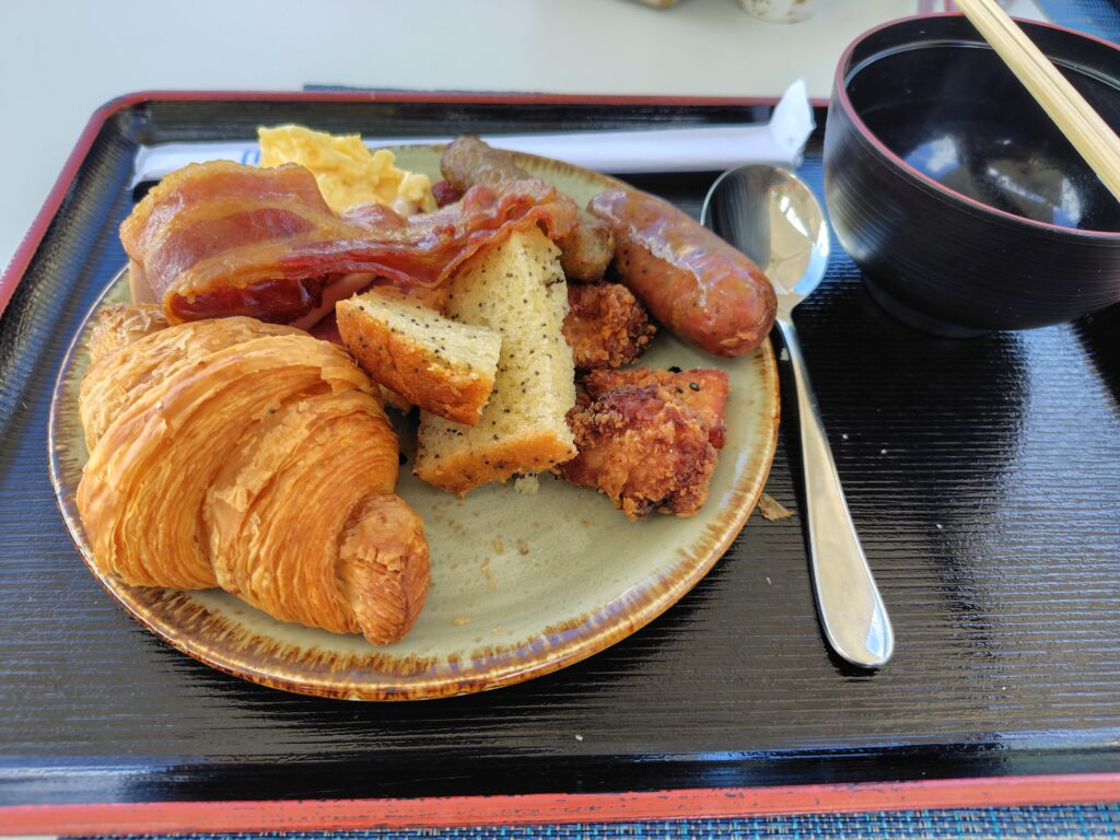 10時に「House Without A Key」でビュッフェ形式の朝食。ベーコン、チーズ、ウインナー、唐揚げ、納豆、味噌汁、イカ刺し、ご飯、クロワッサンなど、和洋さまざまな料理を楽しみました。